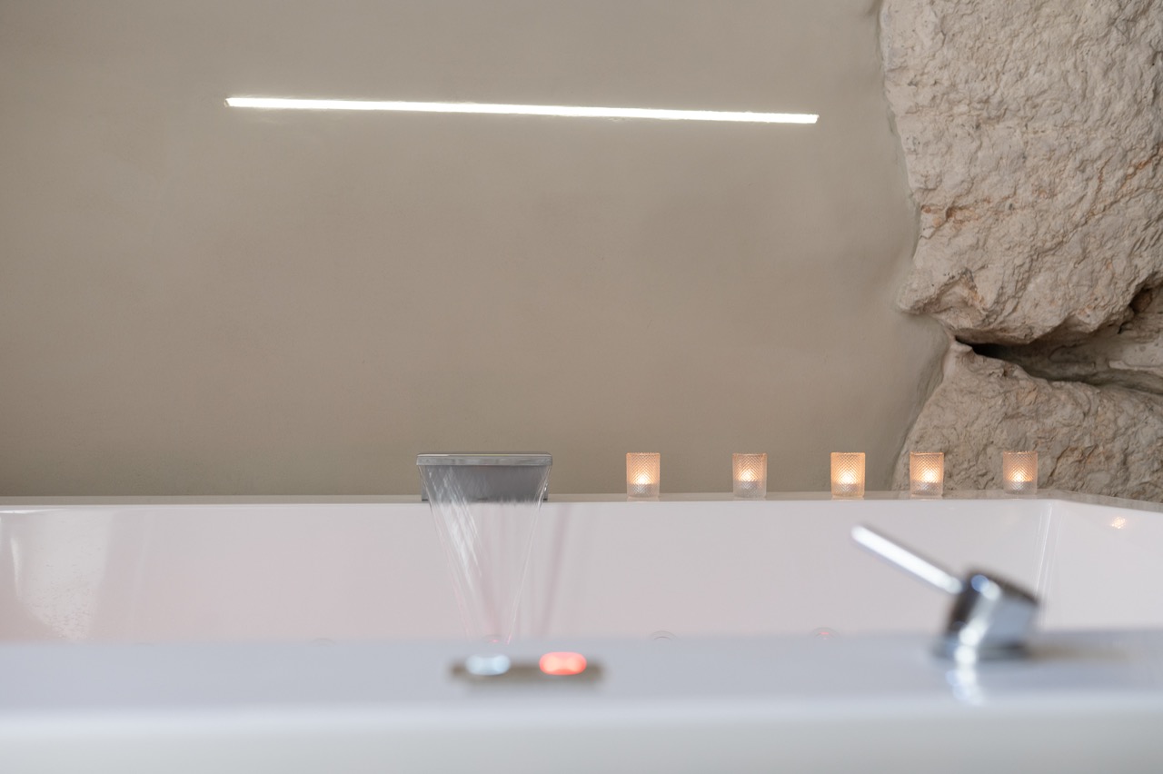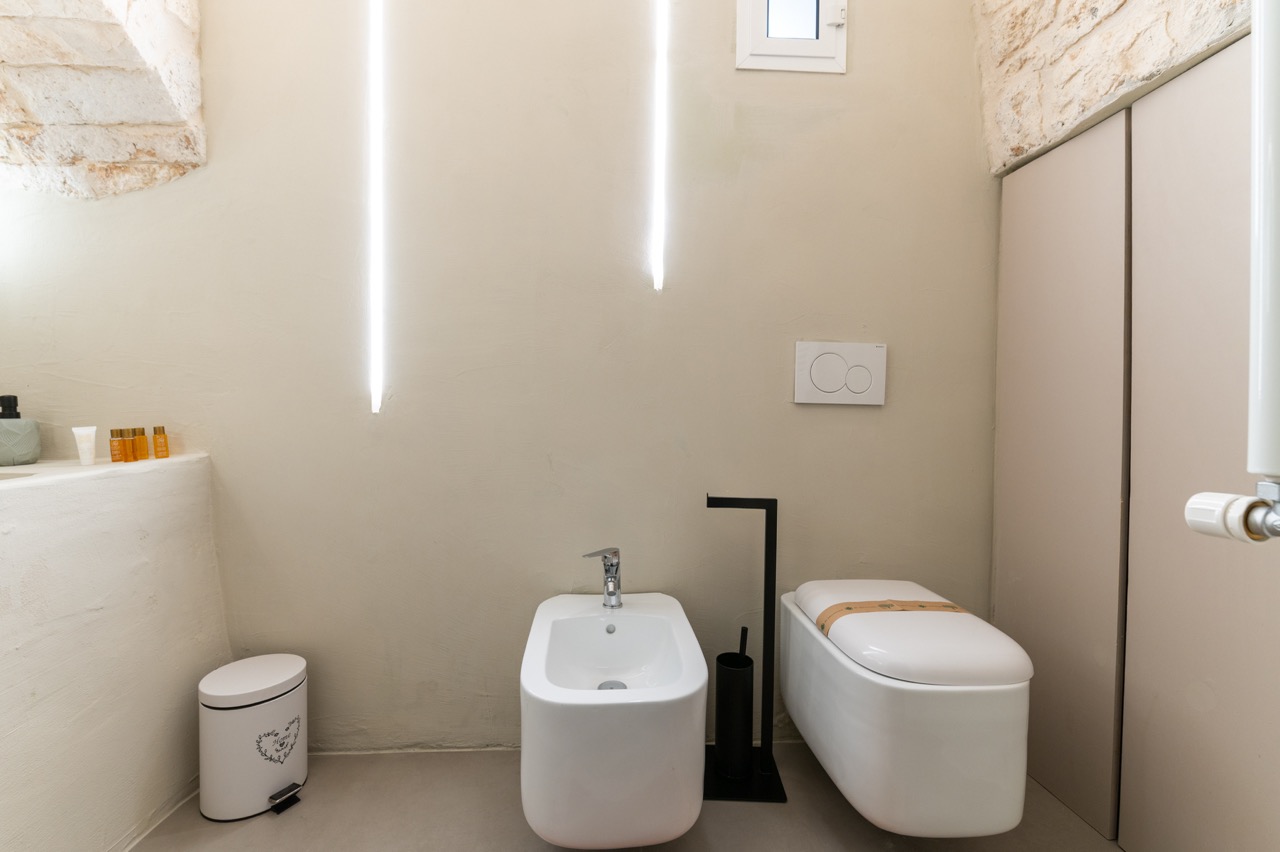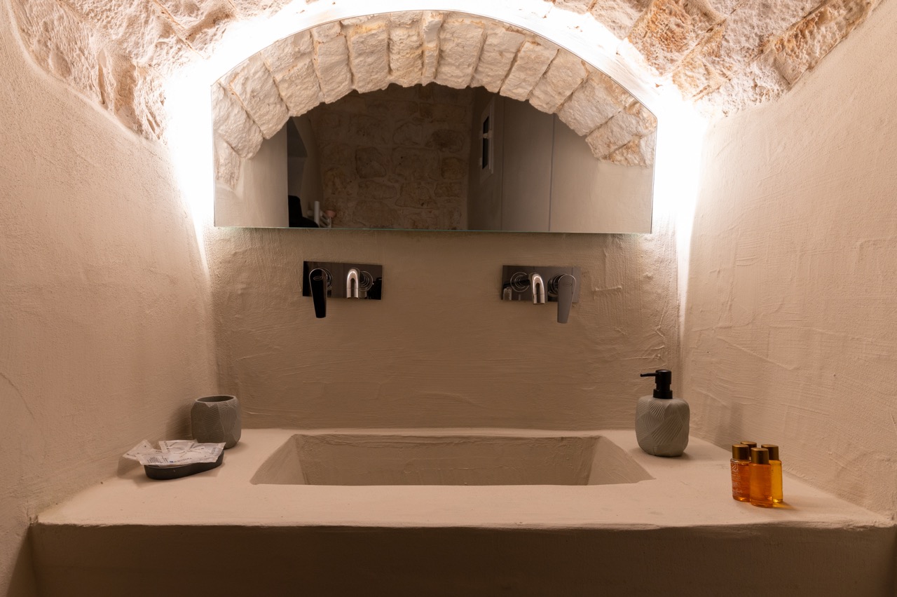 L’abitazione presenta un unico ambiente in cui domina la presenza di una vasca idromassaggio di ultima generazione e una doccia a vista, dotata di illuminazione regolabile da telecomando. In due alcove, separate, è presente un bagno e una cucina attrezzata e spaziosa che permette di vivere tale dimora anche come base ideale delle vacanze in Ostuni, data la posizione strategica.